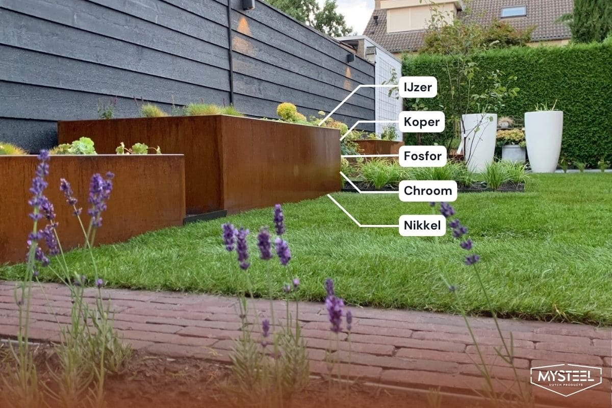 Cortenstahl je znan tudi kot vremensko odporna jeklena zlitina ali COR-TEN jeklo. Večinoma je narejen iz železa, vendar vsebuje tudi baker, krom, nikelj in fosfor. Zaradi te mešanice je cortenstahl edinstveno jeklo, ki je močno, potrebuje malo vzdrževanja in ne rjavi. Plast rje na cortenstahlu pravzaprav ščiti preostanek materiala.