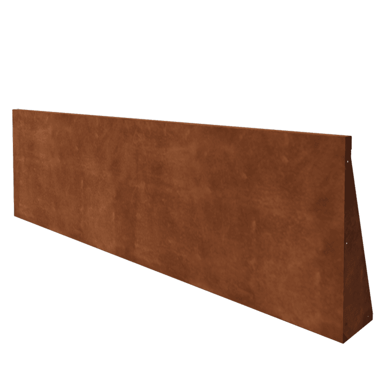 Ta škarpa je izdelana iz visokokakovostnega corten jekla. Ta material naravno razvije zaščitno rjasto plast, ki preprečuje nadaljnjo korozijo in jeklu daje toplo oranžno-rjavo barvo. Postopek rjavenja se začne v nekaj tednih do mesecih in tvori vidno toplo oranžno-rjavo barvo, celoten proces pa lahko traja od 1 do 2 leti. Proces rjavenja lahko pospešite z MySteel pospeševalcem rje.
