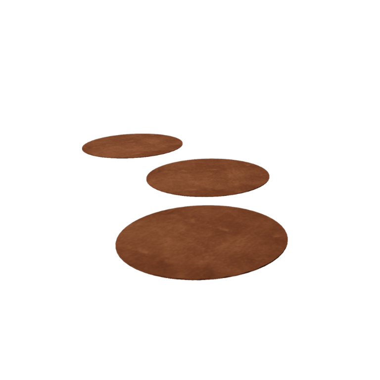 Stopna plošča ima premer 50 cm in je izdelana iz 3 mm debeline corten jekla, s težo približno 8 kg. Dobavljamo jo brez rje, da lahko doma mirno zaženete naravni proces rjavenja. Ploščo lahko preprosto položite neposredno na zemljo ali travo, brez potrebe po montažnem materialu ali pritrdilih.
