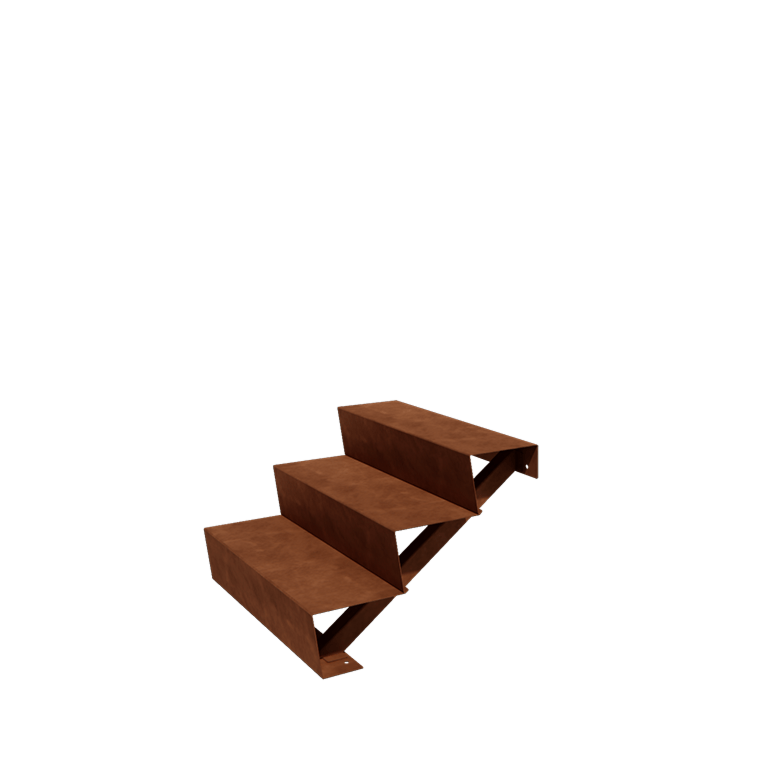 Material Te stopnice so izdelane iz visokokakovostne Corten-A jeklene pločevine. Ta vrsta kovine ima edinstveno lastnost, da tvori zelo gosto oksidno plast (rjavo plast). Rjavljenje je zato nemogoče. Zaradi goste oksidne plasti je globlje ležeči material zaščiten pred kisikom, kar močno upočasni oksidacijo, medtem ko se korozija še naprej odvija. Stopnica iz corten jekla se dobavi nerjavna, v sivi kovinski barvi. Začetek procesa rjavenja se začne v prvih 2 mesecih, za to ni potrebna nobena obdelava. Med procesom rjavenja lahko stopnica pušča madeže. Corten jeklo je zlitina kovin, ki vsebuje železo, vanjo pa so dodani baker, fosfor, silicij, nikelj in krom.