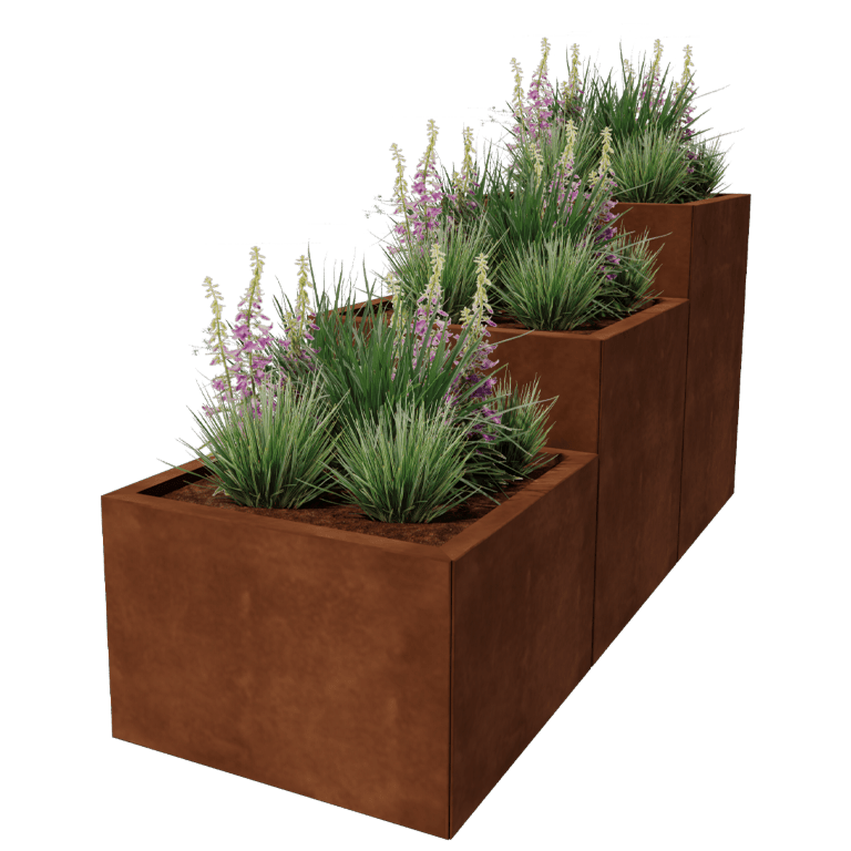 Paneli naših modularnih rastlinskih loncev so izdelani iz visokokakovostne Corten-A jeklene pločevine. Ta vrsta kovine ima edinstveno lastnost, da tvori zelo gosto oksidno plast (rjavenje) . Rjavljenje je zato nemogoče. Zaradi goste oksidne plasti je material, ki leži globlje, zaščiten pred kisikom, kar močno upočasni oksidacijo, medtem ko se korozija nadaljuje. Corten jekleni rastlinski lonec se dobavi nerjaveč, v sivi kovinski barvi. Proces rjavljenja se začne po nekaj tednih do 2 mesecev, za to ni potrebna nobena obdelava. Med procesom rjavljenja lahko rastlinski lonec pušča. Corten jeklo je zlitina kovin, ki vsebuje železo, na katerega so dodani baker, fosfor, silicij, nikelj in krom.
